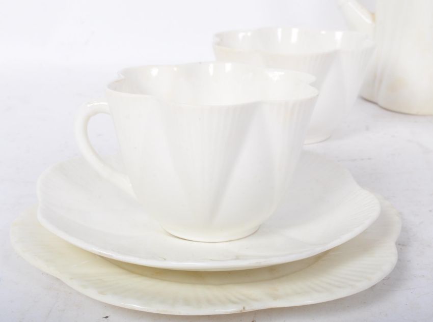 A 19th century Victorian Dainty White Shelley porcelain tea service having a foliate shaped edge. Makers mark to the underside. Reg 272101. Comprising of cups, saucer teapot and bowl.