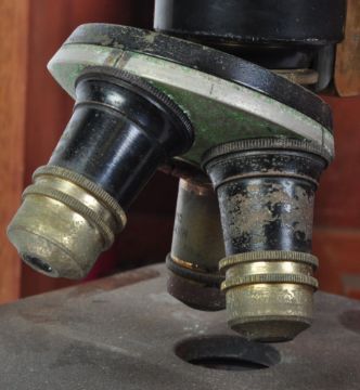A vintage 20th century circa. 1940's W.R. Prior & Co microscope having an ebonised body and brass fittings. Held within original mahogany box. Box measures 28cm x 28cm x 43cm.
