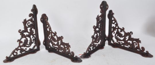 A set of four vintage style cast metal L shaped wall brackets having pierced floral detailing with screw holes to the back plate and support. Measures 28cm X 22cm