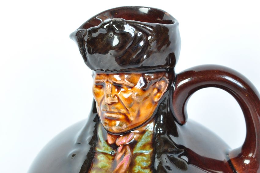 An early 20th century Royal Doulton Kingsware polychrome glazed whiskey flagon of Bill Sykes relief moulded features with transferred print of dog to the verso. Measuring 20cm high. Makers mark to the underside.