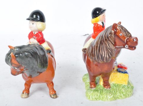 Two vintage 20th century Beswick Norman Thelwell china figurines to include a pony and rider receiving show medals and another horse rider sat atop horse with Learner sign to the reverse of jacket. Marked to base. Measures 11cm tall.