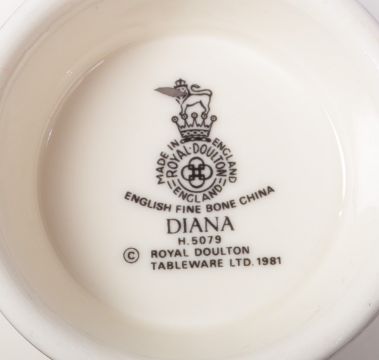 A vintage 20th century Royal Doulton fine bone china tea service in the 'Diana' pattern as part of the Romance collection. Each piece having silvered handle and rim and being decorated with florals. Comprising of teacups, saucers, side plates (trios), bowls, dinner plates, milk jug and sugar bowl.