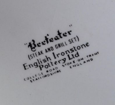 Three vintage 20th century "Beefeater" (steak & grill set) English Ironstone Pottery Ltd to include two green and brown bulls dishes with an orange & purple bull dish. The lot coming with a set of six English Ironstone Pottery Ltd plates with brown bulls decorations, together with a set of four vintage chevron patterned plates. The lot appears in overall good conditions with minor wear commensurate with age, no apparent chip, crack, some crazing and hairline cracks to the brown bulls plates.