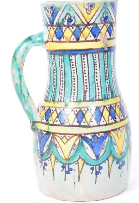 A 19th century Persian Islamic stoneware water jug having a single handle, circular spout and vivid polychrome geometric decoration. Signs of wear and tear commensurate with its age. Measures 23cm high