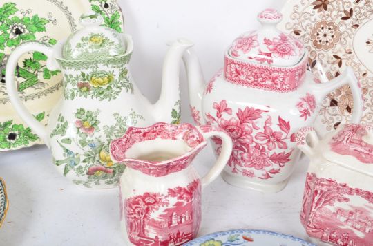 A quantity of  19th century Victorian Masons Stoneware china items in a variety of pattern such as 'Vista', 'Chenille', 'Oriental Pheasants', 'Koro' and 'Jardiniere'. To include serving plate, coffee pots (one being marked up for 'Westminster'), teacups, saucers, plates and cake plate.