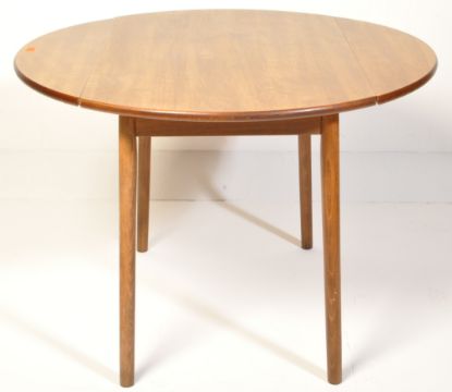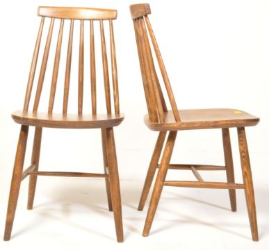 A mid 20th century Dinette kitchen dining room suite in the manner of Ercol. The drop leaf afromosia table with tapering legs supporting rectangular top above with drop leaves. Together with a set of matching beech wood spindle back dining chairs. 73cm x 106cm x 106cm.