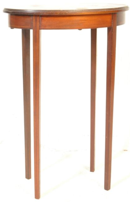 An Edwardian mahogany & walnut inlaid occasional table. The coffee table having an oval shaped top with ogee edges raised on four tapering squared legs. It measures approx. 68cm high x 45 x 28cm.