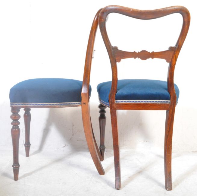 A pair of Victorian 19th century mahogany balloon back dining chairs together with a late 19th century piano stool. The chairs being raised on turned legs with overstuffed blue upholstery. The piano stool with hinged upholstered seat with handles either side. Measures approx. 84cm x 45cm x 50cm.