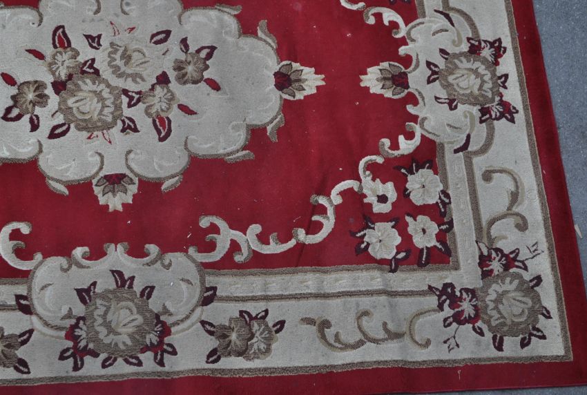 A pair of vintage 20th century Persian Islamic carpet floor rug having a red background with central floral medallion set within a beige & white foliate patterned frame. It measures approx. 240cm x 320cm.