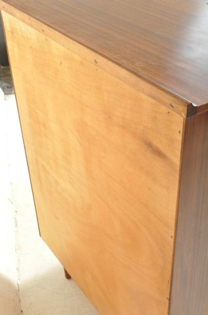 A retro vintage mid 20th century Stag chest of drawers of upright form having a bank of five drawers with two hooped metal pulls raised on upright tapering supports. Measures