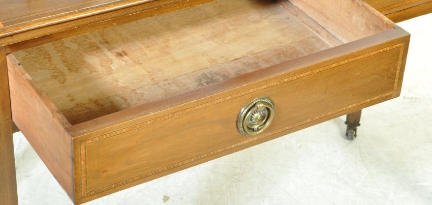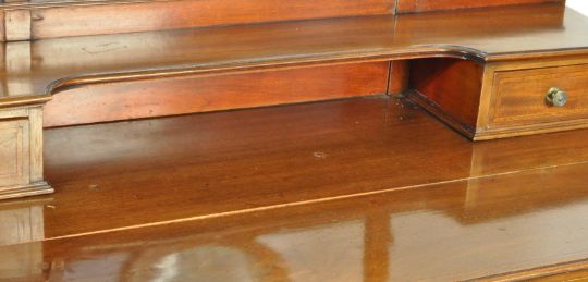 A good Edwardian mahogany and line inlaid dressing table. Tall tapering legs with arched panels to the side supporting a fitted frieze of 2 drawers. Above a tall oval dressing mirror over trinket drawers. Measures approx. 177cm x 108cm x 52cm.