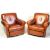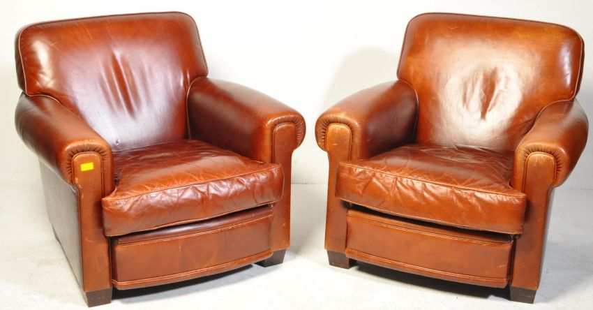 A pair of John Lewis Chesterfield leather club chairs / armchairs / easy chairs having scrolled elbow rests upholstered in brown leather. Each measuring 84cm x 90cm x 97cm.