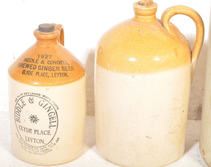 A collection of vintage early 20th century stoneware water flagons to include one marked up for Biddle & Gingell and another with impressed mark for Powell. Measures 46cm tall.