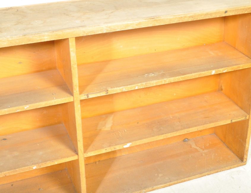 A large long set of vintage mid 20th century 1950s bookcase -  beech shelves having three banks of shelves. Measures 85cm x 250cm x 33cm.