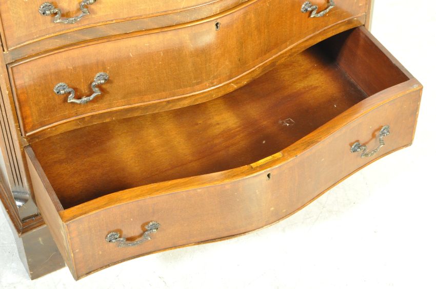 A 19th century George III revival mahogany serpentine fronted kneehole bachelors chest of drawers. Raised on bracket feet with an upright bank of 5 drawers having pull out brushing slider atop. Measures approx. 81cm x 70cm x 48cm.