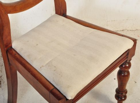 A pair of Victorian 19th century mahogany balloon back dining chairs. Each having balloon back with serpentine shaped top rail over seat upholstered in white fabric raised upon turned wood supports to front alongside sabre legs to back.