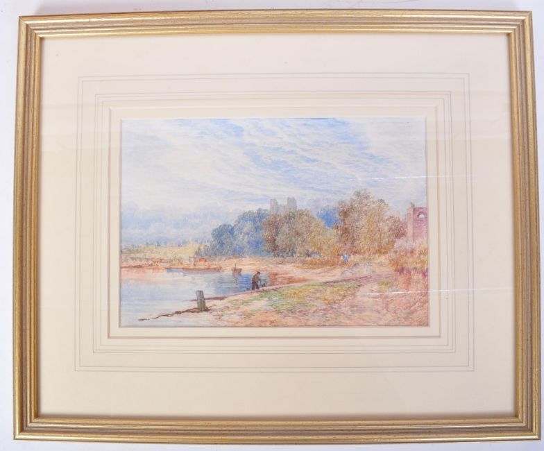 A 19th century Victorian watercolour painting to depict a figure walking along a riverside with castle and trees beyond. Artist monogram to lower corner. Framed and glazed. Measures 39cm x 45cm.