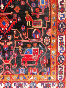 A mid 20th Century Persian / Iranian Navahand fine hand knotted thick pile wool floor carpet rug of large size. Deep natural colours with birds, animals and botanical detailing depicted on a red & black ground against creams, greens blues. In very good condition with high quality craftsmanship. Measures approx; 330cm x 158cm