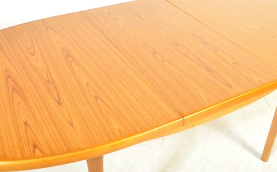 A mid century G-Plan style teak wood dining room suite. The suite comprising an extending dining table with central leaf and raised on turned legs to the fitted frieze. Together with a set of matching railed back teak wood dining chairs. Measures approx. 75cm x 153cm x 92cm.