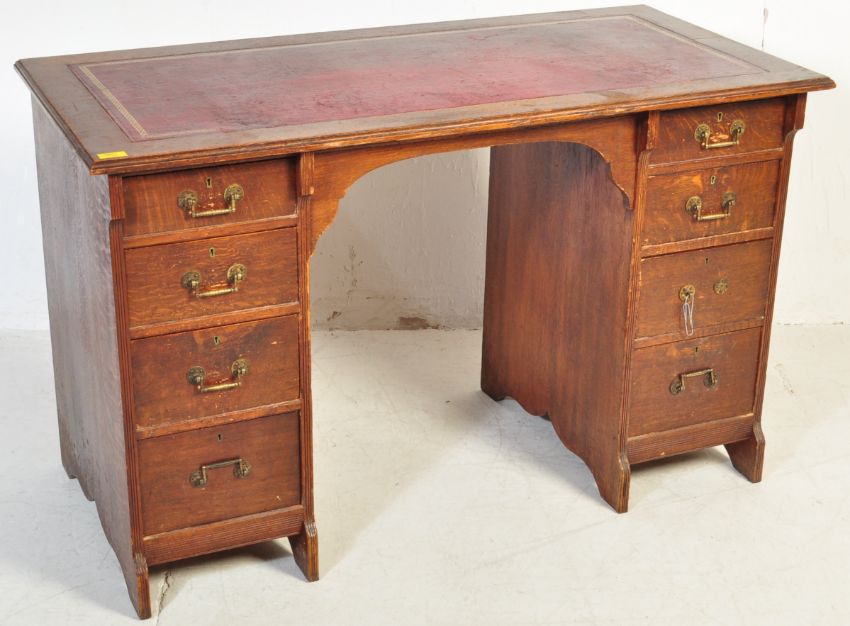 An early 20th century Edwardian circa. 1900's mahogany twin pedestal office desk. The desk having a red tooled leather over two banks of four drawers, each having swan neck gilt metal handles and being raised upon a bracket base. Measures 76 x 123 x 61cm.