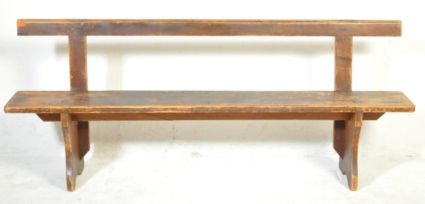A vintage 20th century pine church / ecclesiastical bench having a chamfered back rail, panel seat raised on two upright supports. 83cm x 201cm x 36cm.