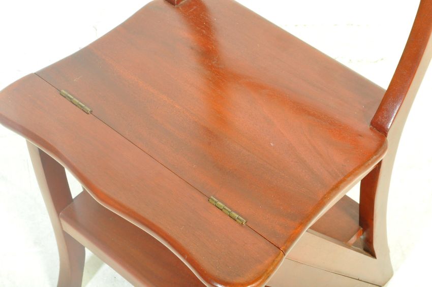 A set of Regency George IV revival mahogany folding library steps converting to a reading chair. Fold over action with twin steps or single chair with panel seat and back rest. Measures approx. 86cm x 37cm x 63cm.
