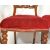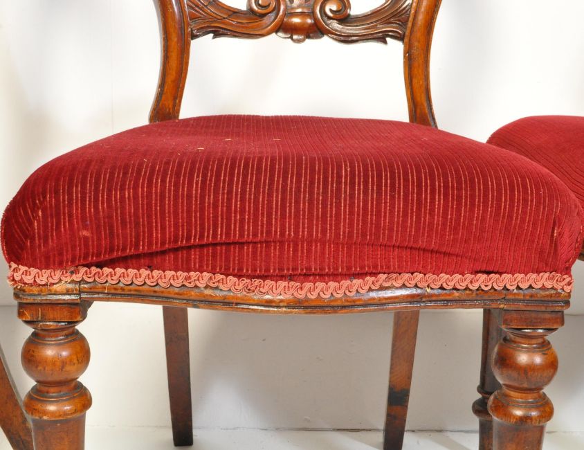 A set of four Victorian 19th century mahogany dining chairs. The chairs having a balloon back with  acanthus leaf motif bar at the centre of the back, with an upholstery velvet cushion over turned legs. Measures approx. 87cm x 49cm x 50cm.