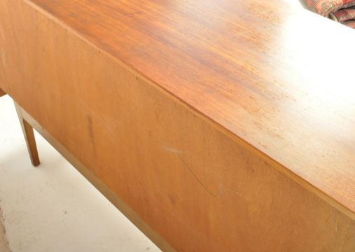 A retro vintage mid 20th century teak sideboard credenza having a bank of three drawers to the left and a double door cabinet to the right raised on upright supports. Measures