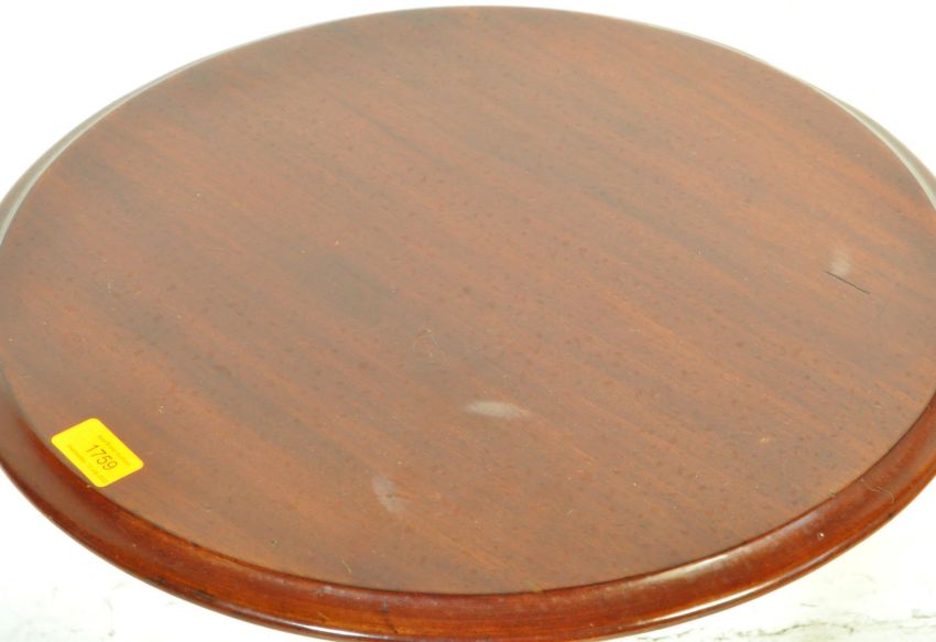 A Victorian 19th century mahogany tripod pedestal table being raised on splayed legs with turned column to centre having a circular table top above. Measures approx.