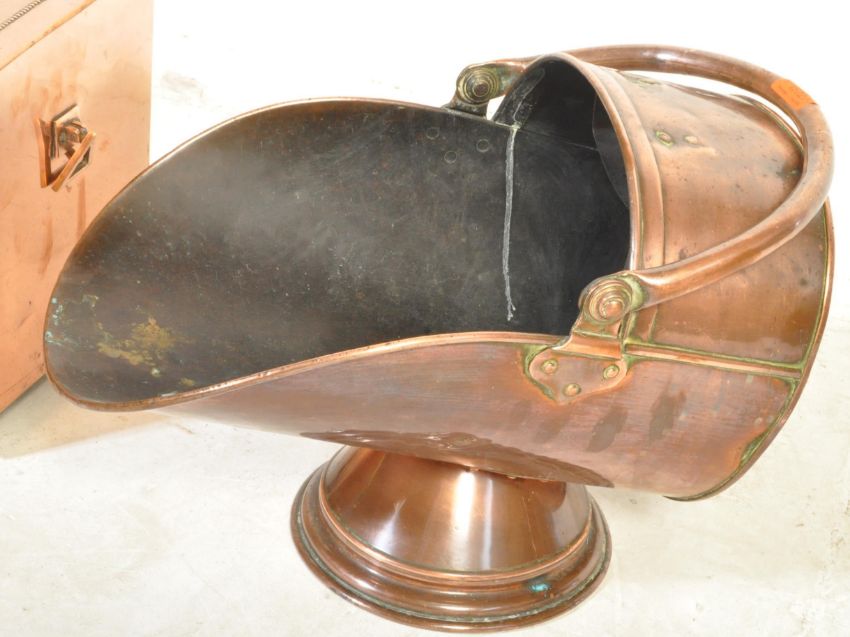 An early 20th century Art Deco copper coal box / purdonium of cuboid form having geometric patterns to the lid with stylised handles to each side. Together with a coal scuttle and copper kettle.