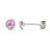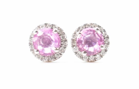 A pair of hallmarked 9ct white gold, pink sapphire and diamond stud earrings. The earrings being set with a round cut pink sapphire with a halo of round cut diamonds. 375 common control marks to posts. Sapphire measures 3.8mm. Weight 0.9g.