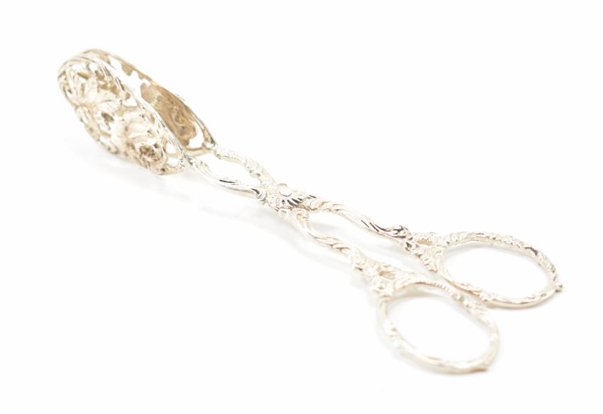 A vintage continental silver pair of sugar tongs. The tongs having pierced rose detailing to the nips with scrolled rococo handles. Marked 835 to the handles. Measures 13cm. Weight 27.0g.
