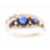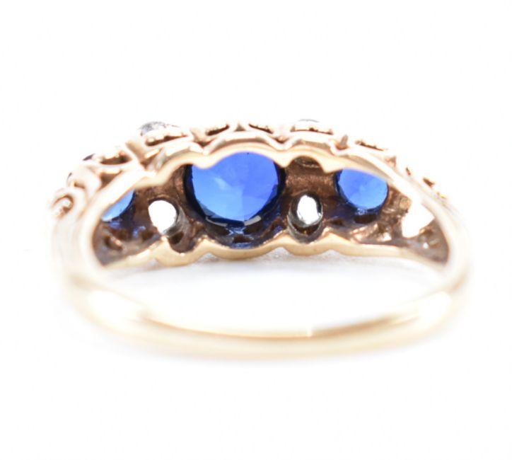 A hallmarked 9ct gold synthetic sapphire and white stone three stone ring. The ring being set with three round cut synthetic sapphire and four round cut white stones. Hallmarked London 1973. Weight 3.2g. Size N.5.
