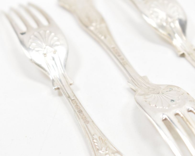 A group of three United Cutlers Ltd silver hallmarked forks. The forks having moulded scallop shell handles. Hallmarked Sheffield 2000. Weight 196g. Measures 38.4cm.