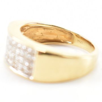 A gold and diamond set ring. The ring being set with forty square cut diamonds to the head. Marked 750 to the shank, tests indicate 18ct gold. Weight 7.1g. Size O.
