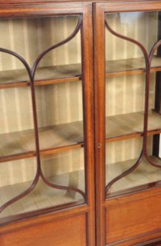 An early 20th century Edwardian era circa. 1900's vitrine display cabinet. The cabinet having astragal lattice glazing to twin doors, opening to reveal a shelved interior. The cabinet raised upon cabriole supports united by apron of serpentine form.
