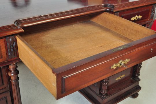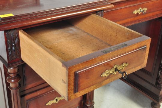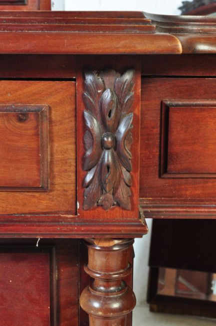 A Victorian 19th century mahogany pedestal dressing table. The dressing table having a triptych mirror raised over an inverted breakfront table top with a row of three drawers upon twin pedestals, each having a bank of three drawers raised on bun feet (damage to one of the bun feet - will need repair). The desk having four reeded turned wood columns along the pedestals corners and ornate brass spandrels to the escutcheons surround.