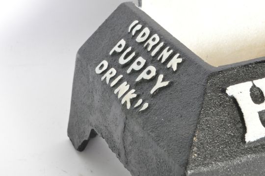 A vintage style cast iron Hudson`s dog bowl in black and white. The rectangular bowl reading "Buy Hudson`s Soap" to back and "Drink Puppy Drink" to the sides. It measures approx. 40cm long.