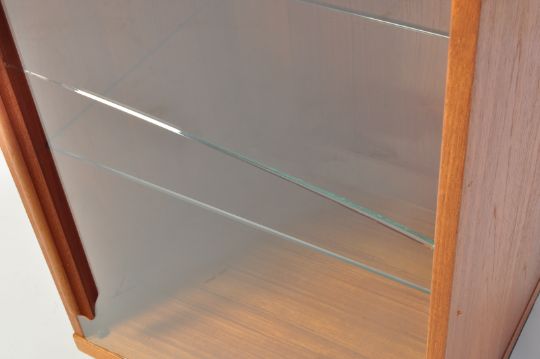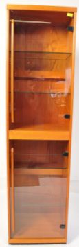 A vintage retro 20th century teak wood upright glazed cabinet having a horizontal bar handle to side with a shelved interior. Measures approx: 184cm x 47cm x 40cm