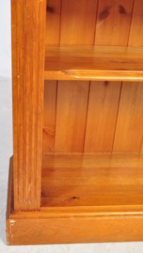 A large 20th century country pine upright bookcase / display cabinet being raised on a flared top with central shelves having a pediment atop. Measures 183 x 111 x 27cm.