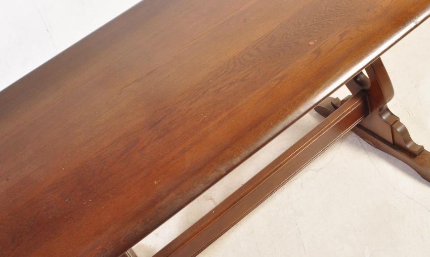 A mid 20th century mahogany dining table with trestle base united by central stretcher. Together with six dining chairs. Measures 77cm x 135cm x 71cm