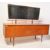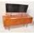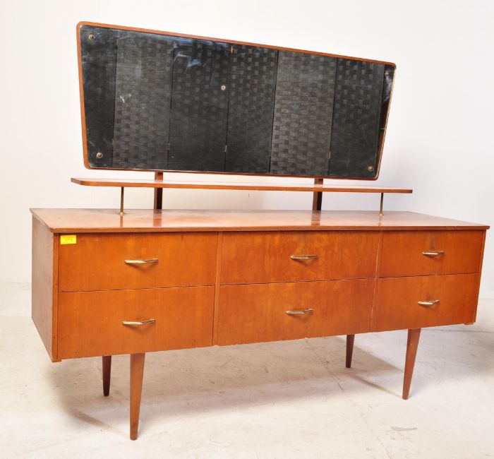 A retro vintage mid 20th century circa. 1960's teak dressing table. The dressing table having an atomic style central mirror over three banks of two drawers, each having angular brass handles raised upon tapering supports. Measures approx: 120cm x 147cm x 46cm.