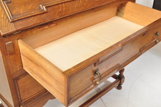 A 1920's Jacobean Revival oak bureau having geometric patterned moulding to the fall front writing area. The bureau opens to reveal a fully appointed interior atop two drawers raise on barley twist supports united by peripheral stretchers. Measures 102 x 89 x 42cm.