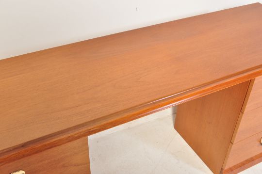 Meredew Avalon - A vintage retro mid 20th century teak wood dressing table having a mirror to top with drawers beneath. Together with an Avalon bedside cabinet chest. Each having gilt metal lipped handles. Measures approx: 67cm x 148cm x 43cm