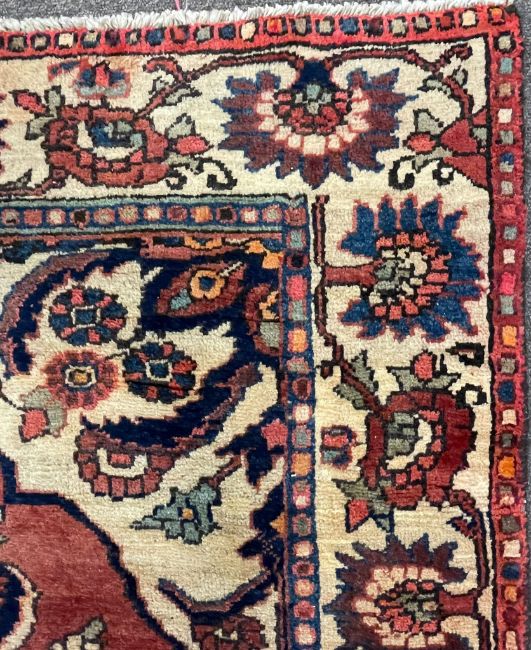 A mid century Islamic Persian Bakhtiar Kelleh rug having a central red panel filled with dark and light blue floral medallions on a cream background with floral decorations around. Measures approx. 305cm x 132cm.