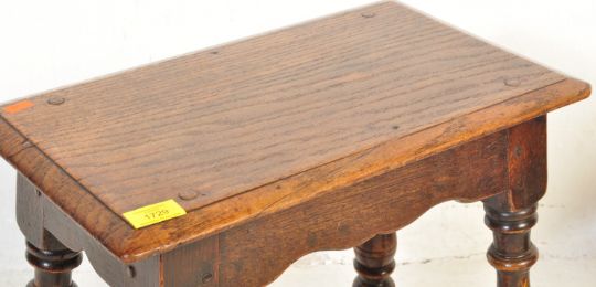 A Jacobean revival early 20th century oak joint stool. The stool  being peg jointed having a plain frieze over turned ring supports united by peripherals stretchers