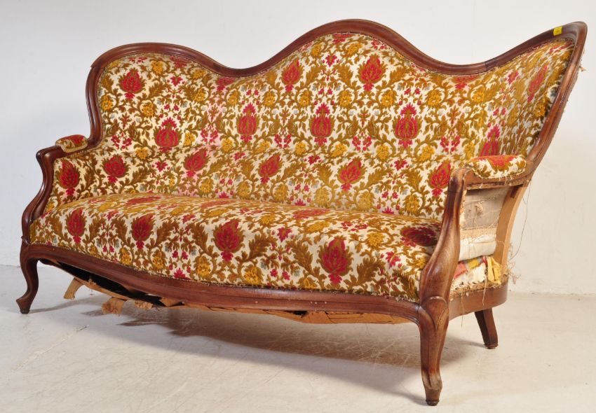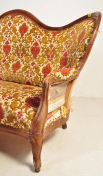 A 19th century Victorian mahogany double ended chesterfield sofa settee. The settee having a mahogany winged hump-back frame of serpentine form with scrolled cushioned elbow rests. The sofa being upholstered in a French damask jacquard fabric.