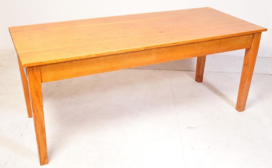 A retro vintage mid 20th century oak refectory table of rectangular form having a flared top over a plain frieze raised on upright supports. Measures 76 x 183 x 75cm.