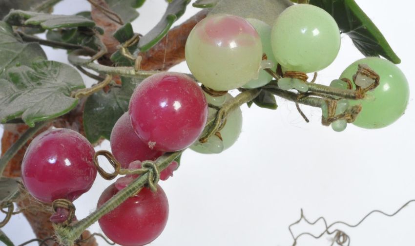 A vintage 20th century Chinese glass specimen type bonsai tree ornament having glass grape and leaves. Measures 36cm tall.