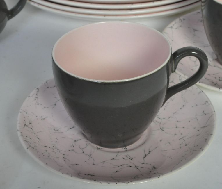 Myott - Kingpin - A vintage 20th century bone china Myott part tea service in the Kingpin pattern in a pink and grey colourway. The service comprising of teacups, saucers, side plates, dinner plates and teapot. Overall good condition.